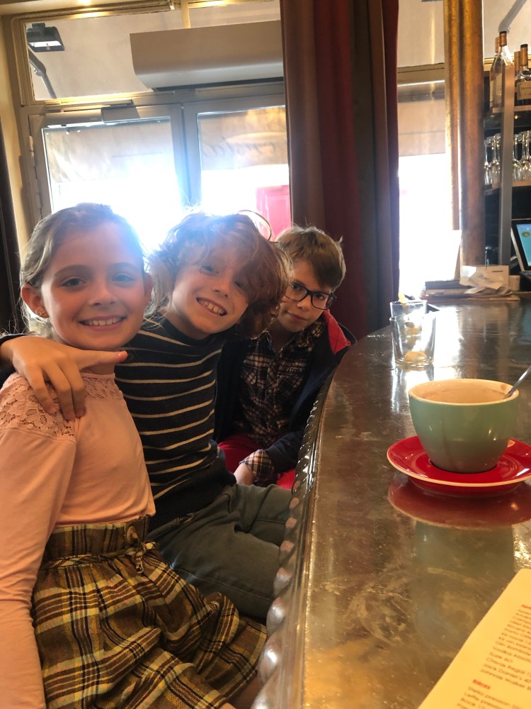 Day 45 Wednesday, October 9: It’s Wednesday, choir day! Our friends from choir have asked us to come early and have lunch at their apartment (the amazing one with the view of the gold dome above Napoleon’s tomb). We run around trying to find some fantastic dessert to take and finally get the merengues we loved. We arrive and have a lovely lunch of chicken and potatoes and salad and sweets. It was great to be around friends. I take the kids off to choir and enjoy their rehearsal again. After, we grab a coffee. Actually, we don’t grab it because they don’t really grab stuff the way we do (and they don’t drink Starbucks, either. They actually frown on it. There are many Starbucks here, so someone is drinking it, but it doesn’t seem to be the French). We stop in the cafe, sit at the counter, order the delicious cappuccino. The kids order lemonade with Grenadine…a new thing they are loving. We receive said drinks, enjoy them, pay for them, then head out. We walk to the Champ de Mars (the huge green space, playground, etc. at the foot of the Eiffel Tower) for a little table tennis. Laure has the instruments we need because they are regular table tennis players. Raphael is good. Laure is good. Jullian the 5 year old is good. But Geer is too! I was so impressed with his skills. Gotta get him some ping pong when we get home. I know you’re tired of hearing this, but it started to rain. No, it started to pour! We run run run through the park to the nearest metro and head home soaked to the bone. Dinner at home and a little family movie to wrap up the day.